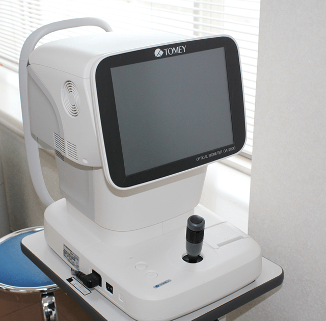 白内障の手術に必要な眼軸長(眼の長さ)や角膜の丸みや前房深度、水晶体厚みなど多くの部分の測定を目に触れることなく一度に測定します。
