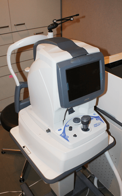 目に空気を当てて眼圧を測定する機器です。眼圧検査では、簡単にいうと「目のかたさ」を測っています。緑内障を見つけるための大切な検査です。